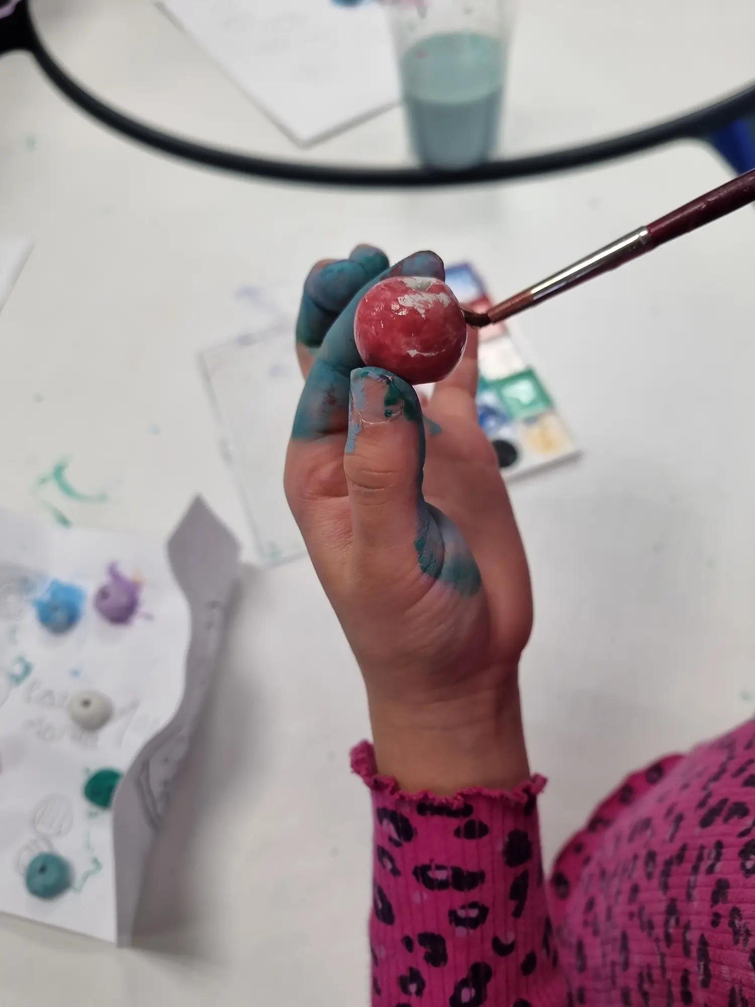 This activity requires time, patience, and careful fine-motor skills as the children shape their designs. Each student was given eight pieces of clay to mold into beads, pennies, or other creative shapes of their choice. Once completed, the pieces were left to dry before being painted.