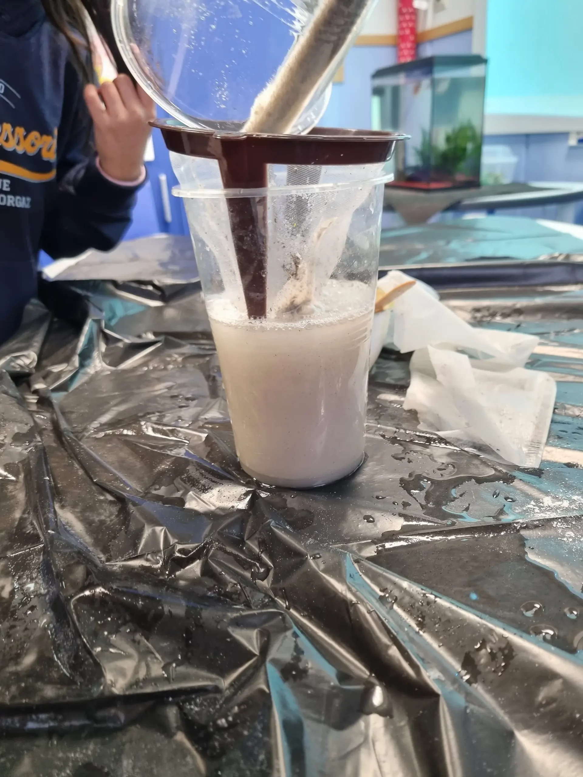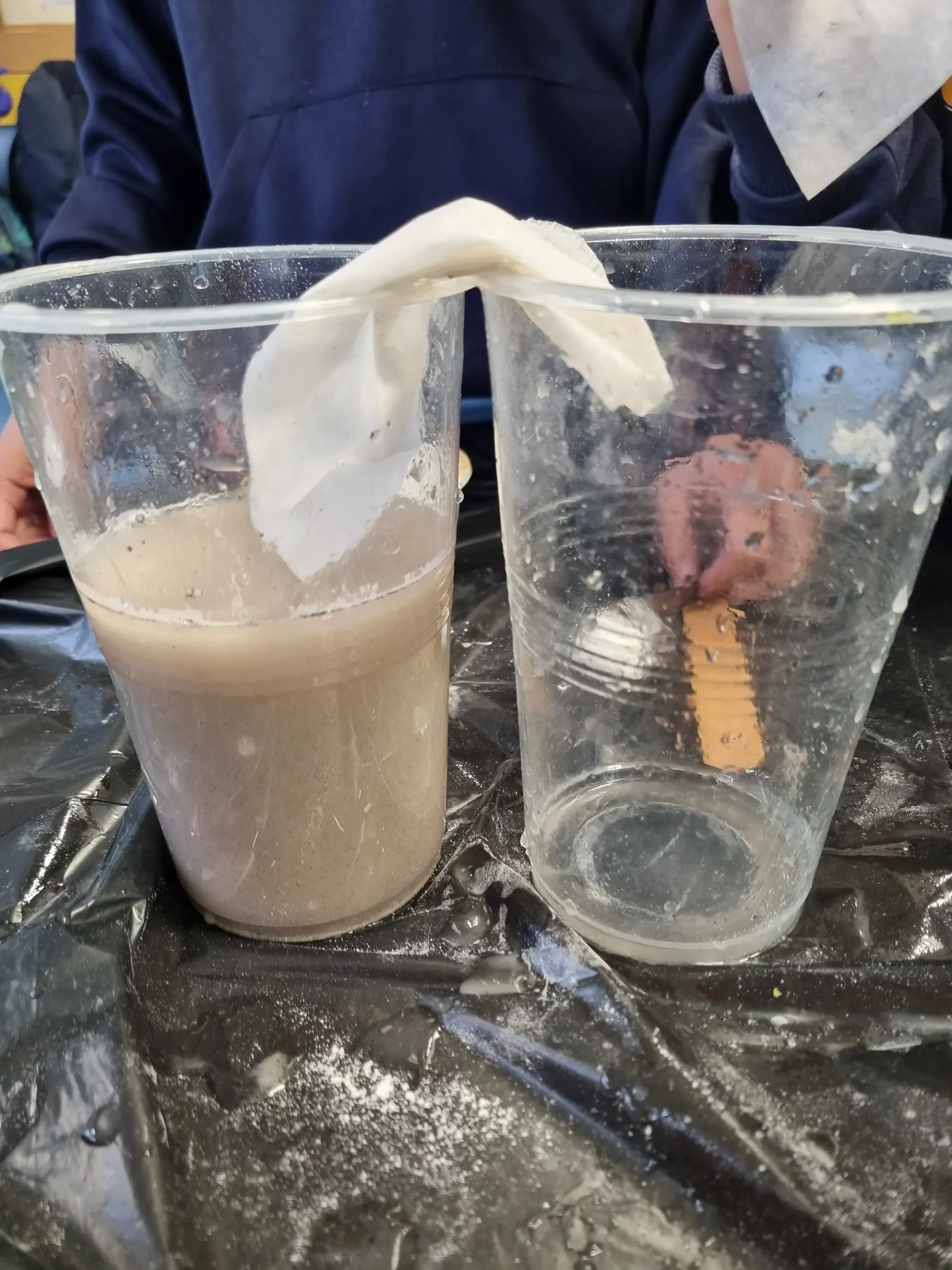 This week in Natural Science, the students took on a fascinating challenge. On their tables, they found a cup of muddy water alongside a clean cup, a sieve, two coffee filters, flour, a scoop, and a stirrer. Their task? To clean the water until it looked as clear as tap water.