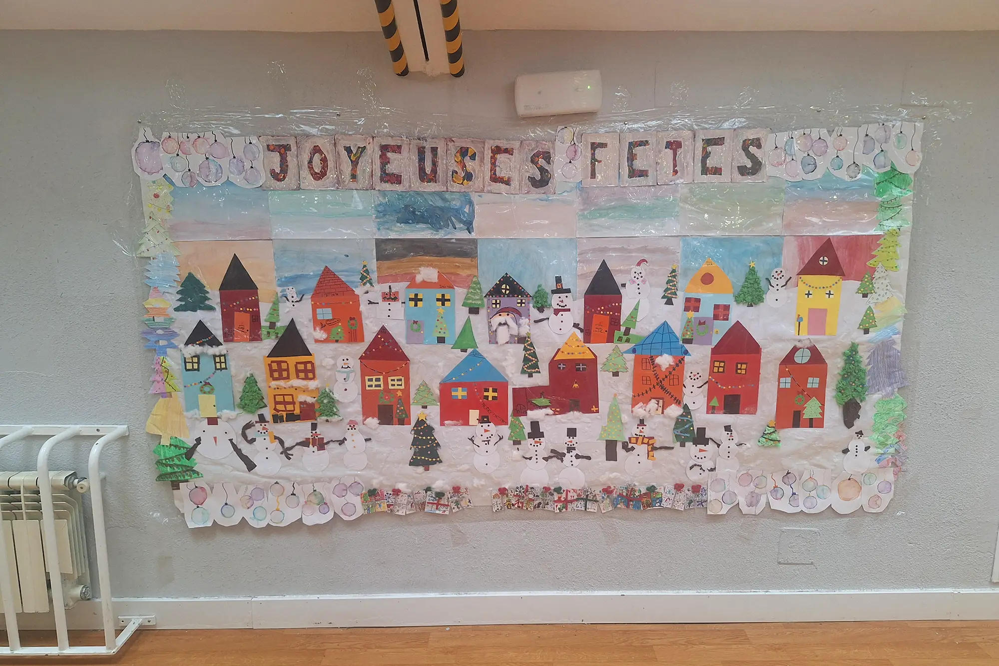 Para decorar las paredes para nuestros conciertos navideños, los alumnos de 1.º a 5.º de primaria colaboraron para crear unos preciosos murales navideños. Los alumnos de 1.º hicieron regalos brillantes y relucientes, los de 2.º recortaron muñecos de nieve (¡y también algunos monstruos de nieve!), los de 3.º crearon cada uno una parte de un cielo invernal único, los de 4.º construyeron «casas navideñas» y los de 5.º hicieron una variedad de pinos. El efecto general es tan brillante como estas fiestas y fue el complemento perfecto para las actuaciones de nuestros alumnos.