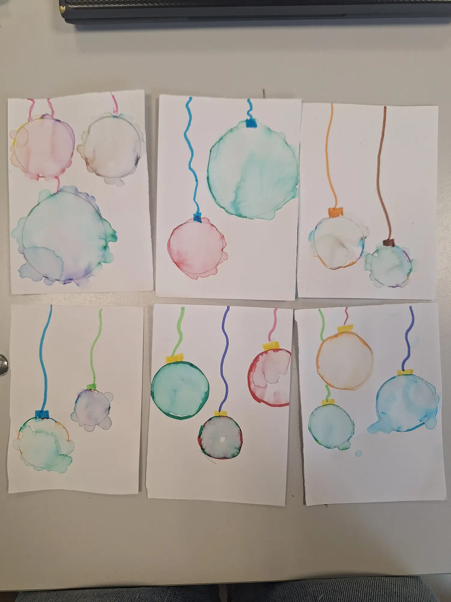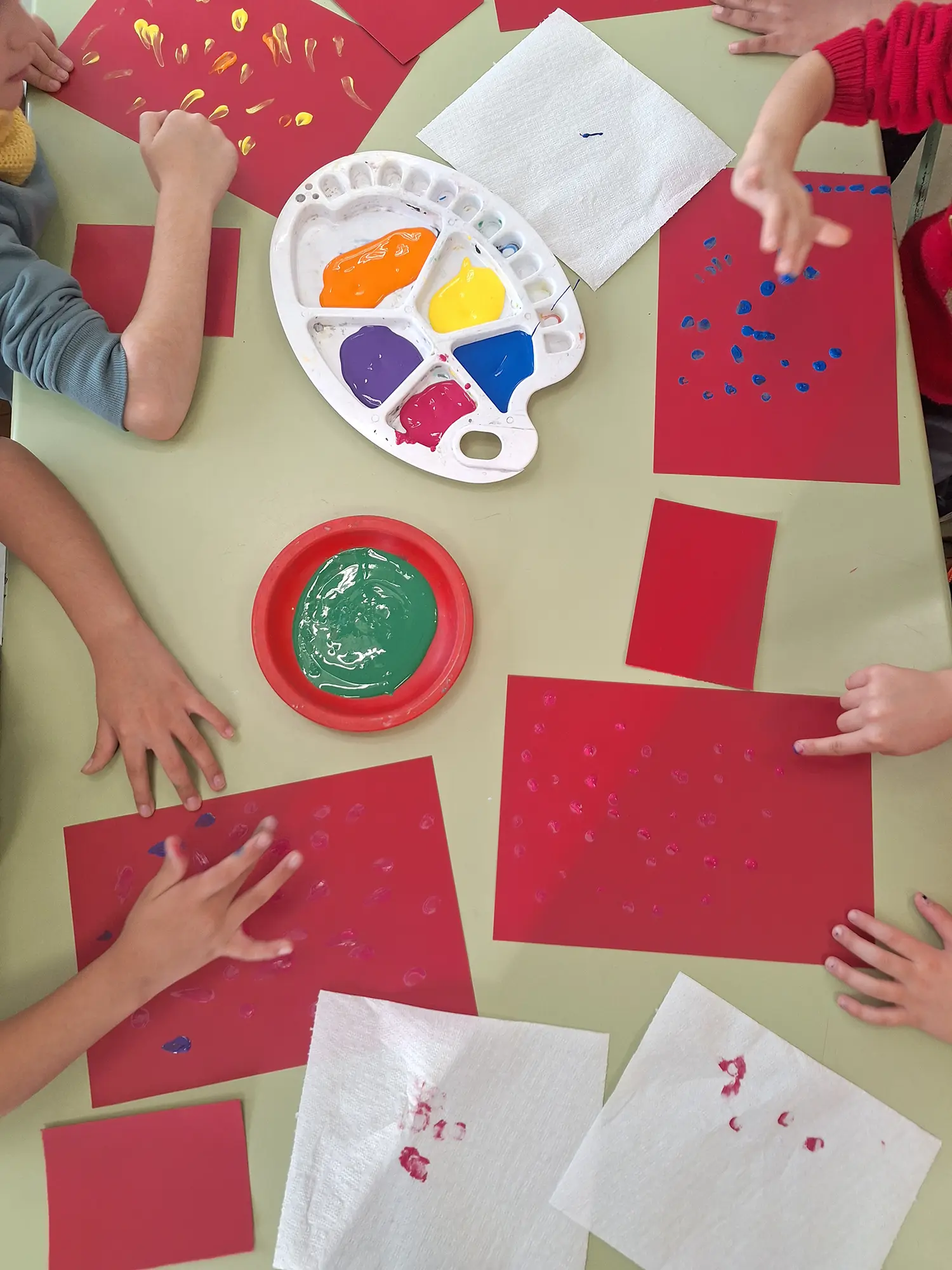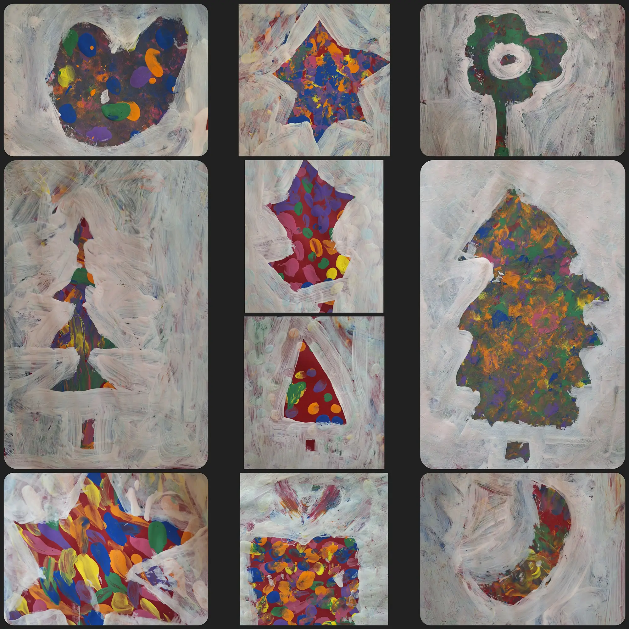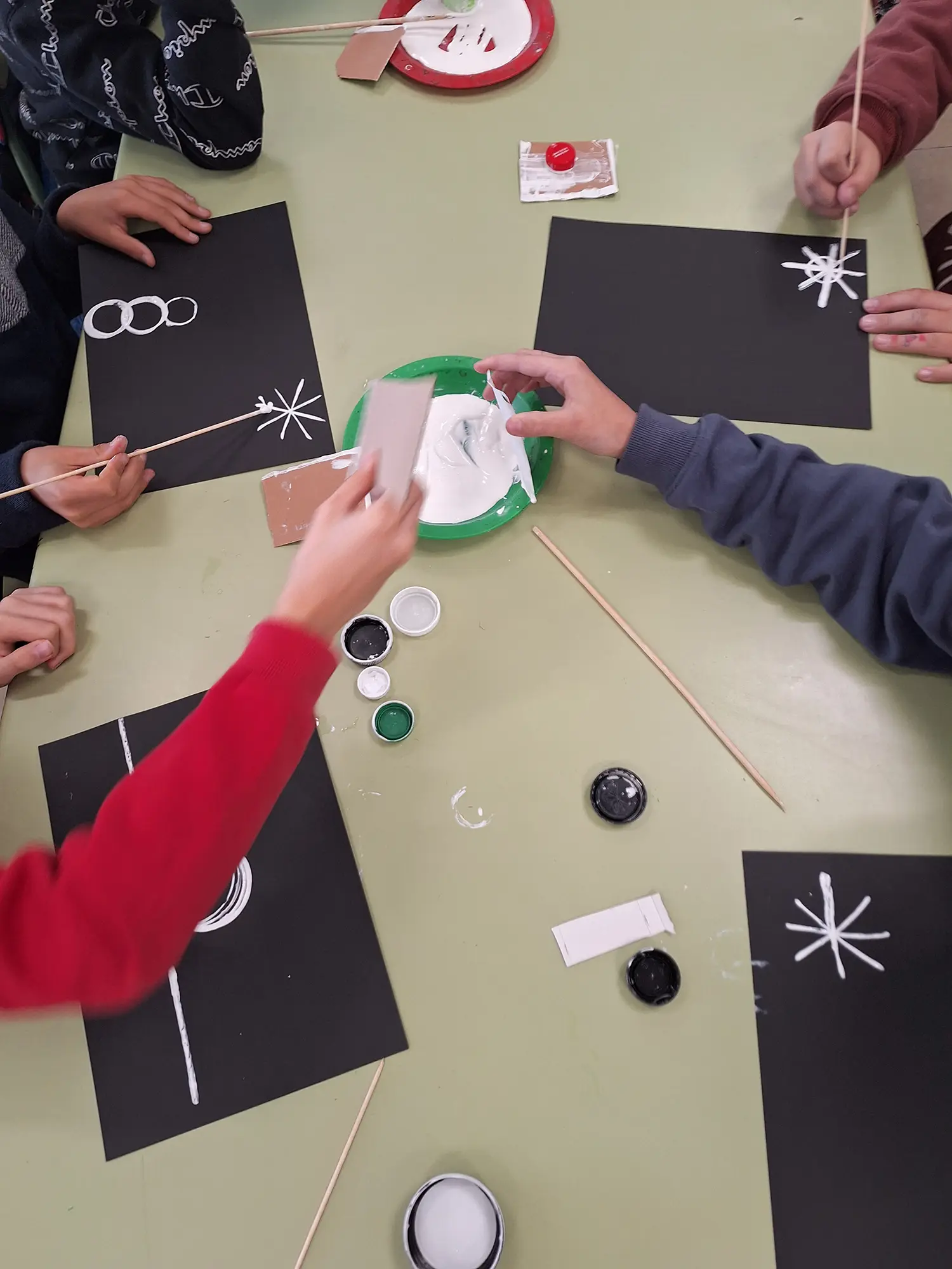 Del mismo modo, para entrar en el espíritu navideño, realizamos varios mini proyectos artísticos. Nuestros alumnos de sexto grado crearon escenas de una belleza inquietante utilizando cartulina negra y pintura blanca. El reto consistía en no utilizar ni un solo pincel. Pintaron con trozos de cartón, tapones de botellas y palitos. ¡Los resultados son bastante sorprendentes! Los alumnos de tercer grado hicieron adornos dibujando círculos con rotuladores lavables, luego rociaron agua y utilizaron los dedos para mezclar los colores. Los alumnos de segundo ayudaron a crear las letras de nuestros murales navideños pintando con los dedos muchos colores sobre papel y luego utilizando pintura blanca para crear las formas de las letras con espacio negativo. También pudieron crear sus propias pinturas de esta manera y aprender sobre el espacio negativo de una forma positiva. Como decían los murales: ¡Felices fiestas, Felices Fiestas y Joyeuses Fêtes!