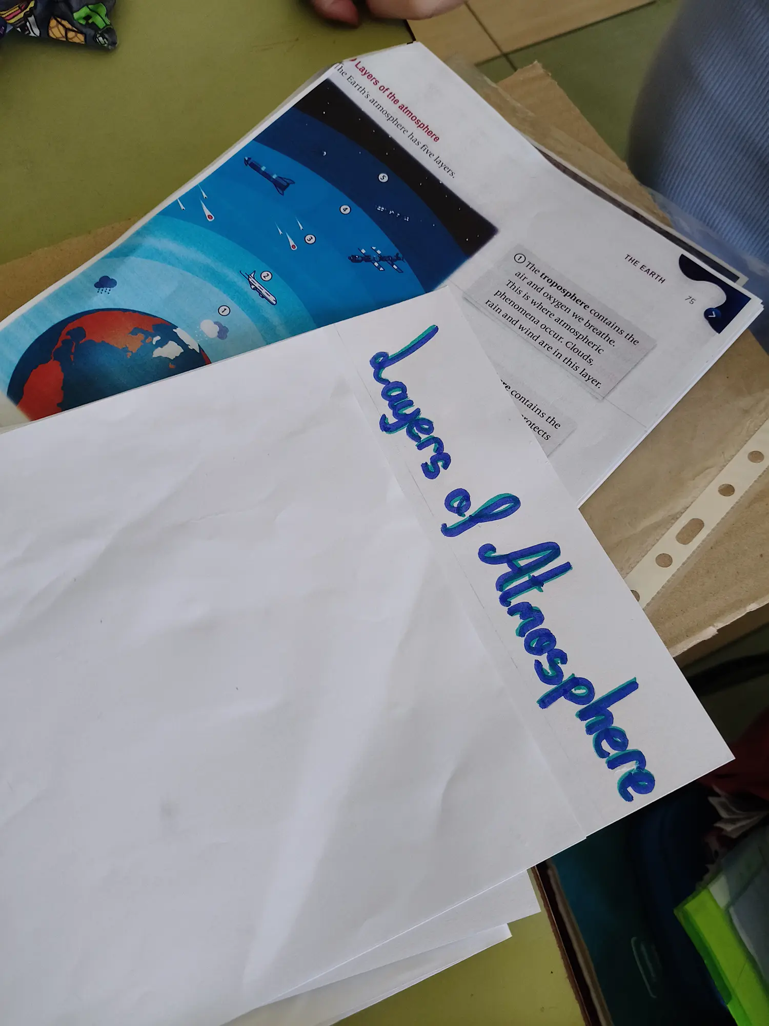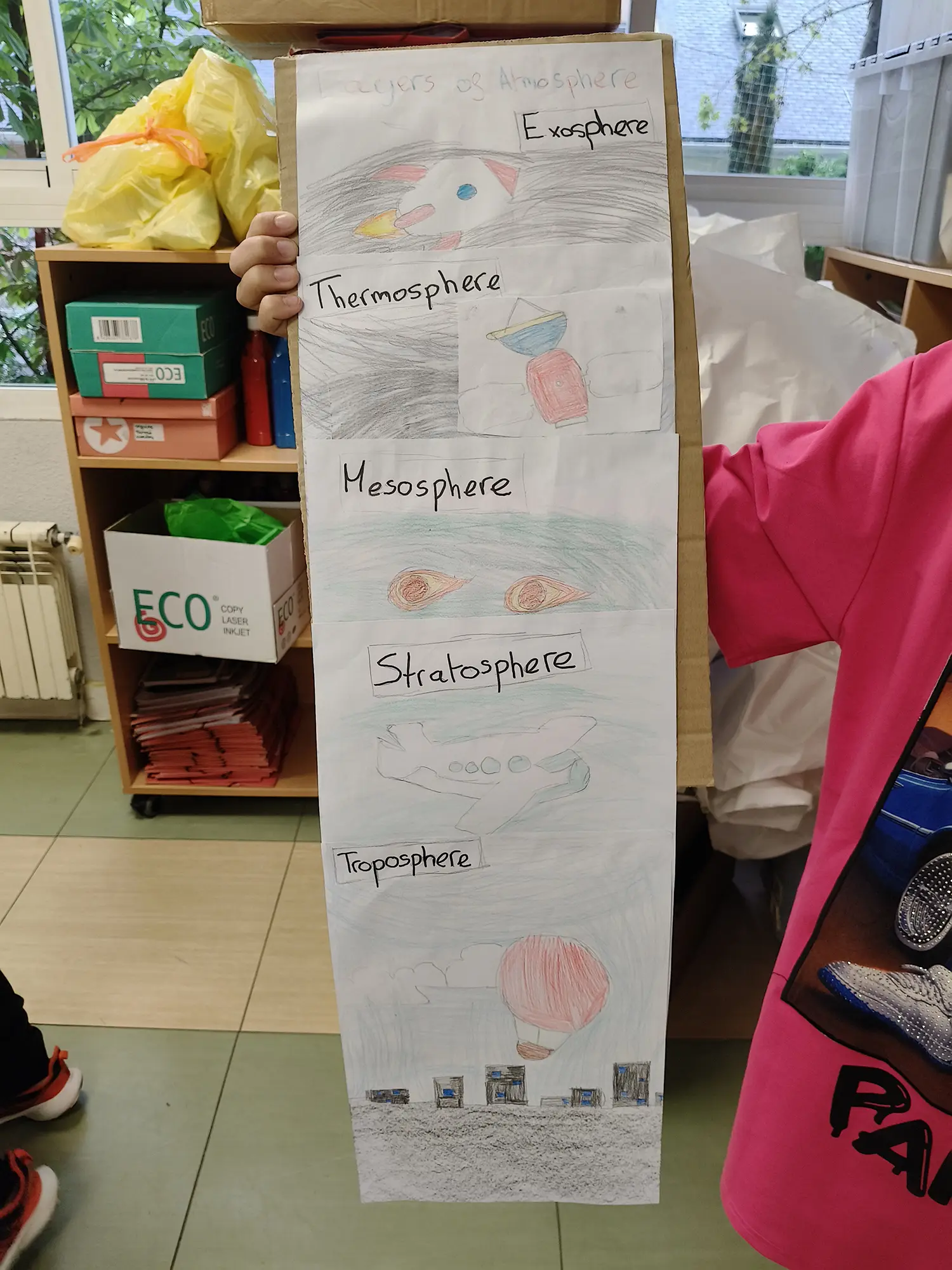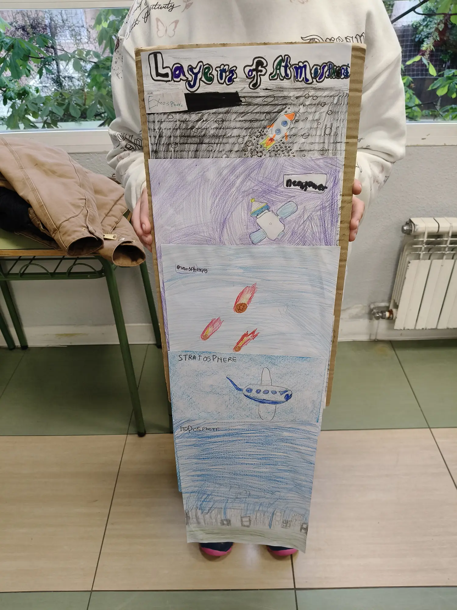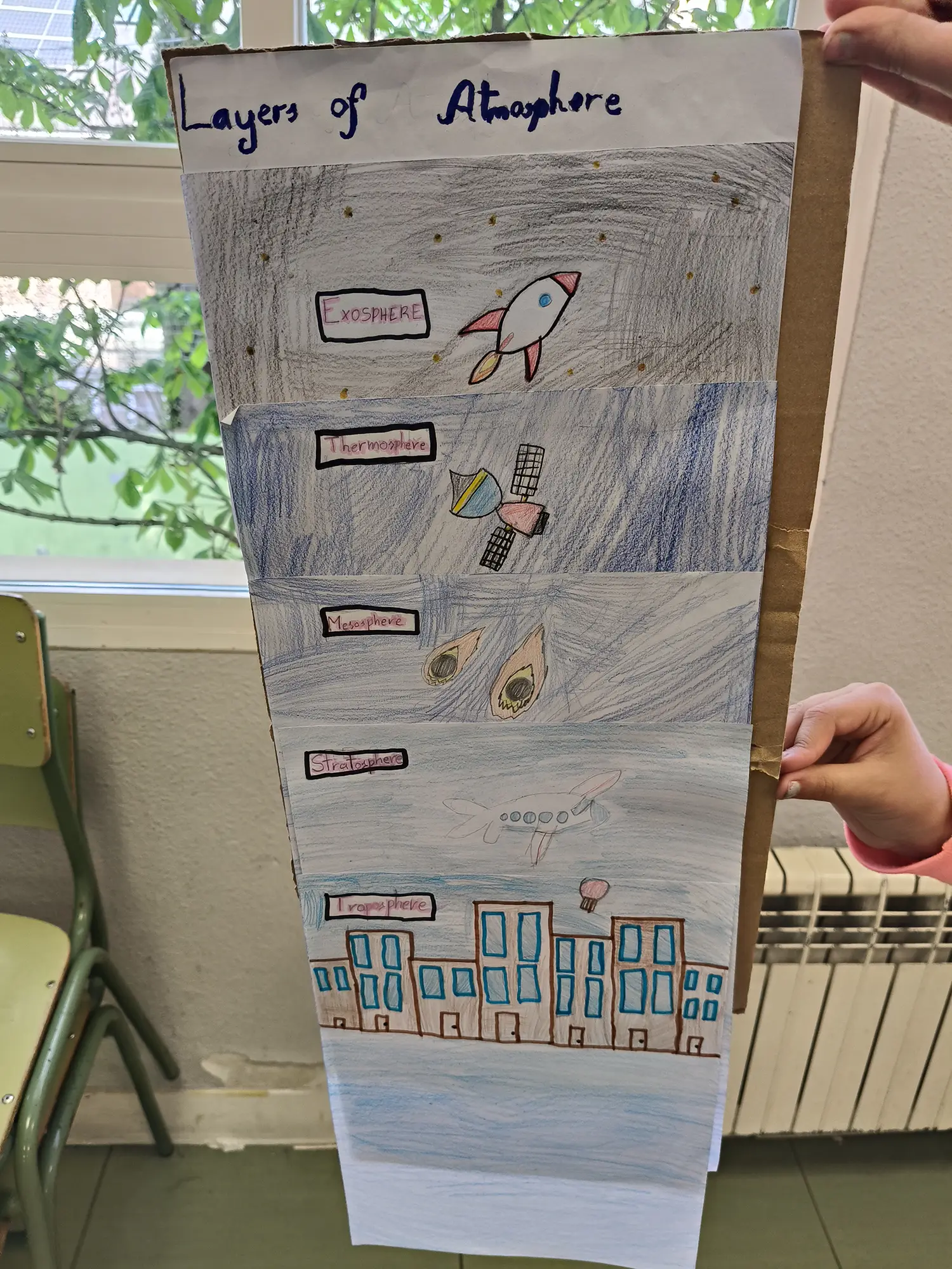 During this unit, our third-grade students have been learning about the layers of the atmosphere. The atmosphere is divided into five layers: the troposphere, stratosphere, mesosphere, thermosphere, and exosphere. For this group project, students created examples of elements found in each layer to illustrate them. In the final product, the different layers are stacked in order, and if you lift one, you can see the layer beneath it.