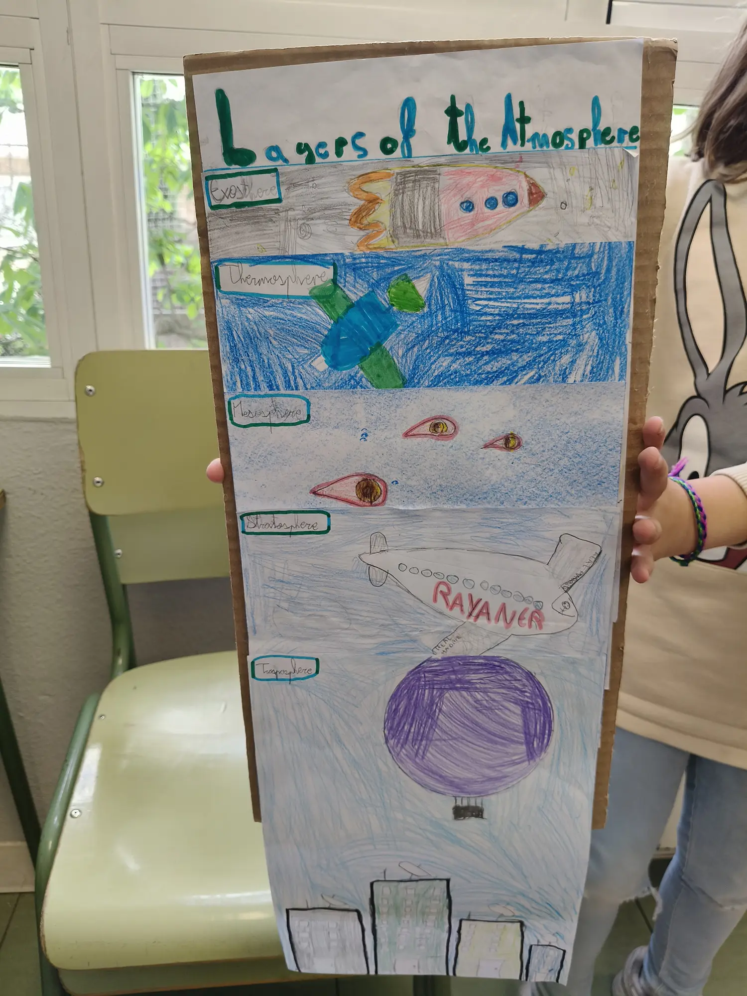 Durante esta unidad, nuestros alumnos de tercer grado han estado aprendiendo sobre las capas de la atmósfera. La atmósfera se divide en cinco capas: la troposfera, la estratosfera, la mesosfera, la termosfera y la exosfera. Para este proyecto grupal, los alumnos crearon ejemplos de elementos presentes en cada capa para ilustrarlas. En el producto final, las diferentes capas están apiladas en orden, y si levantas una, puedes ver la capa que está debajo.