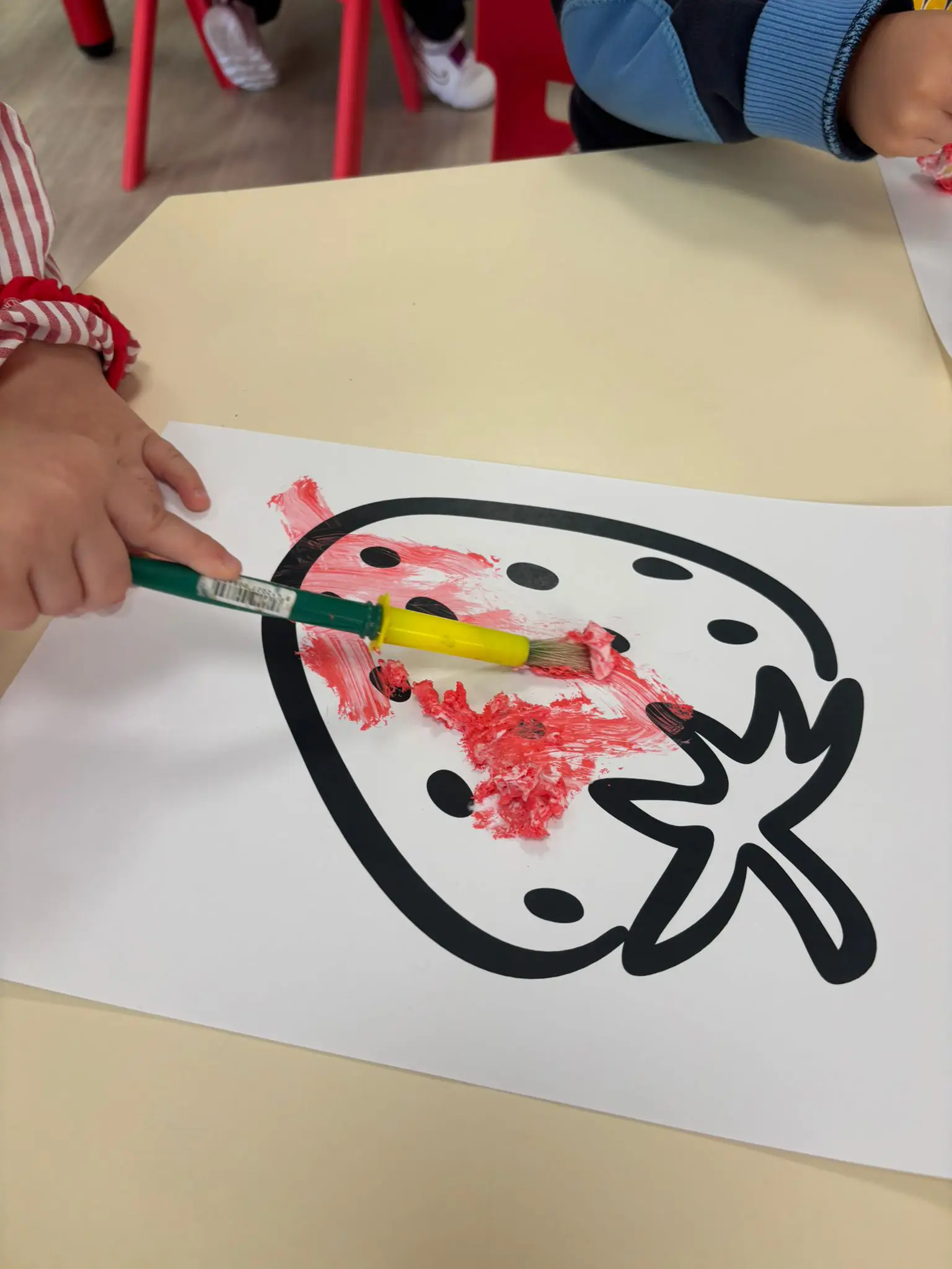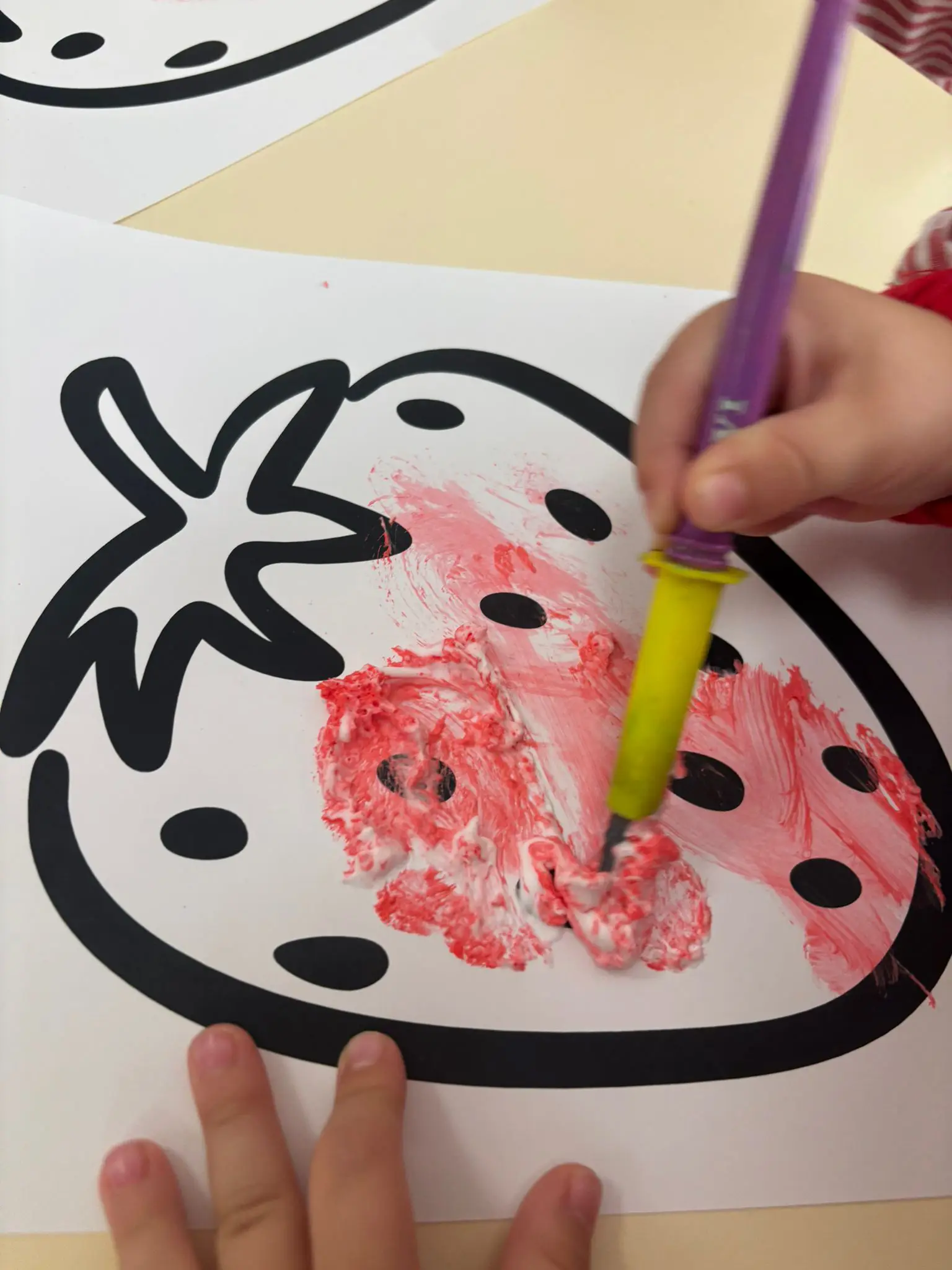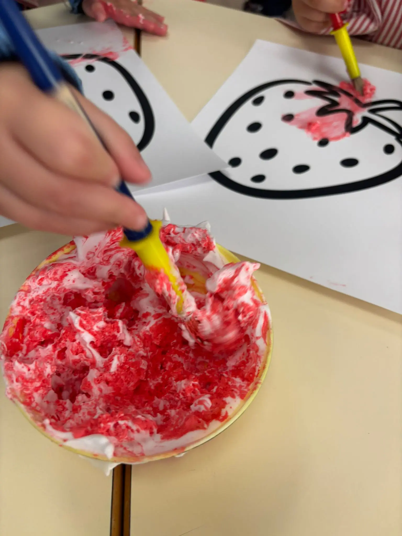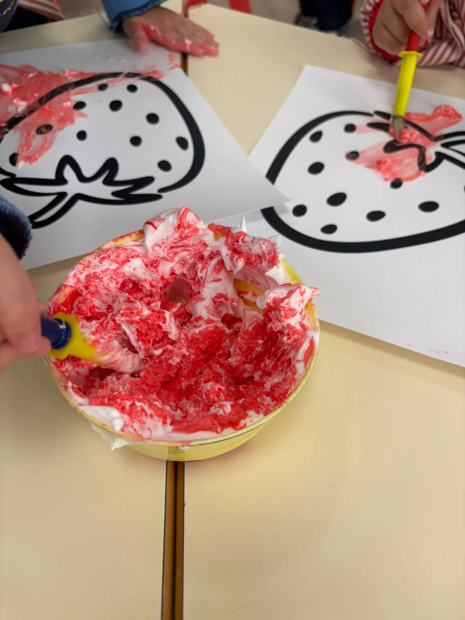 Today at school, a group of tiny artists embarked on an exciting journey of creativity. The little ones from the two-year-old classroom participated in an activity that promised to be both fun and magical: painting strawberries with foam!