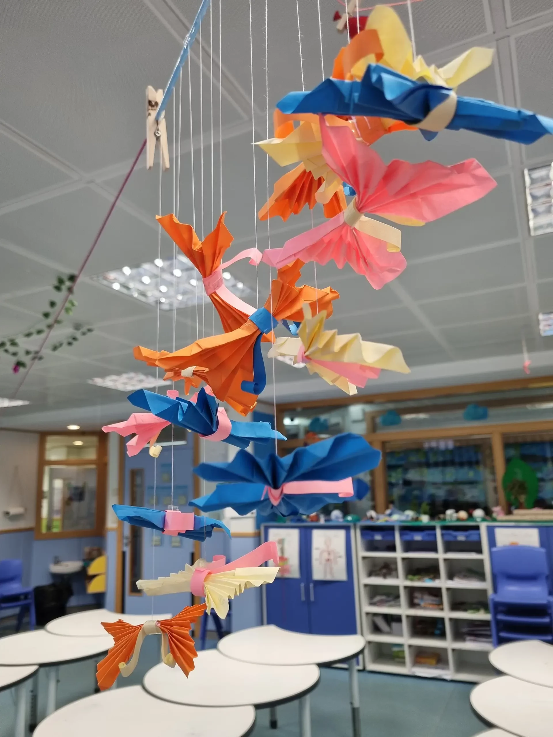 In 2º Primary Science, the students took part in an exciting demonstration to learn about how monarch butterflies migrate. First, they created their own 3D butterflies, which were then placed together on a zipline stretching from one end of the classroom to the other. Using an inflated balloon to represent natural elements like wind, we gently propelled the butterflies along the line, simulating their long journey from colder climates to warmer ones. The children also designed different climates on large pieces of card, helping the butterflies “know” where to migrate. This hands-on activity made learning about migration fun, memorable, and easy to understand.