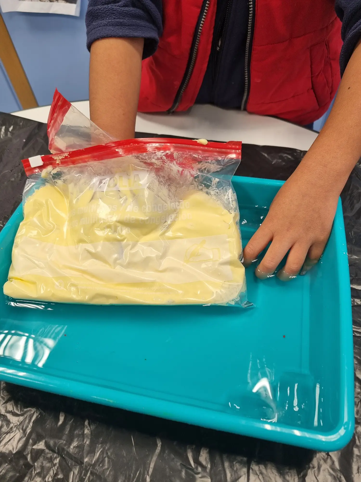Para simular la grasa de una ballena, cubrimos una mano con una bolsa llena de mantequilla y dejamos la otra mano al descubierto. Cuando metimos ambas manos en agua helada, ¡la diferencia se notó inmediatamente! La mano con «grasa» se mantuvo mucho más caliente, lo que ayudó a los niños a sentir claramente cómo esta gruesa capa de grasa protege a las ballenas del frío. Fue un experimento práctico (¡y un poco frío!) que dio vida al aprendizaje y nos ayudó a comprender mejor cómo los animales se adaptan a su entorno.